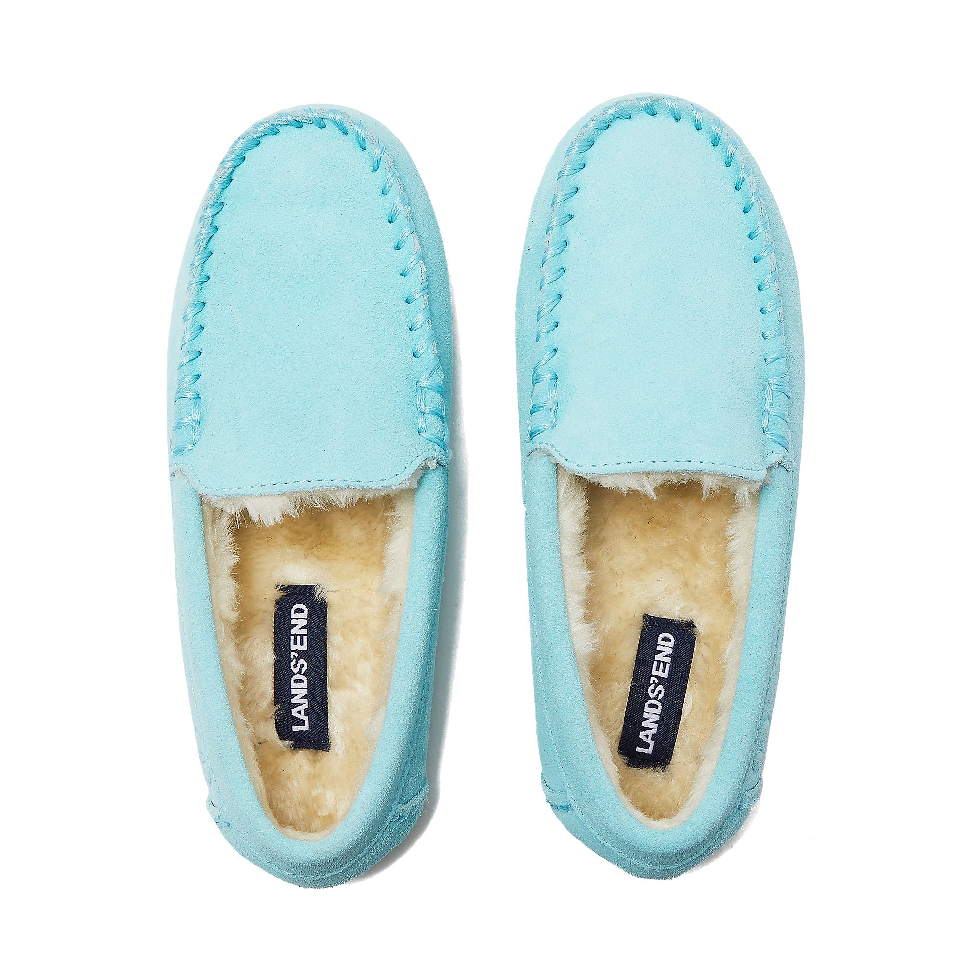 Our best selling Kids' Fuzzy Lined Suede Moccasin Slippers are back to wrap little feet in plush comfort. Crafted with a suede upper and classic moccasin toe stitching, these slippers offer a timeless look that never goes out of style. The soft faux fur lining cradles young feet in luxurious warmth, while the cushioned foam insole ensures all-day comfort. Ideal for reading a good book on the couch, playing board games inside while it snows outside, being hypnotically entranced by a mesmerizing video game, or bringing the footwear fashion to sleepovers with friends. The rubberized outsole provides the perfect balance of flexibility and grip, allowing for safe indoor and light outdoor wear. Match these moccasins with mom and dad for a coordinated family look that's equally adorable and comfortable. Choose from four vibrant colors to pair with any personality or pajama set: Pale Aqua Ice, Radiant Navy, Rich Red, and English Tan. Kids' shoe sizes range from Little Kid 11 to Big Kid 7.NOTE: Click the Make it Personal button (above) to add an engraved initial(s)