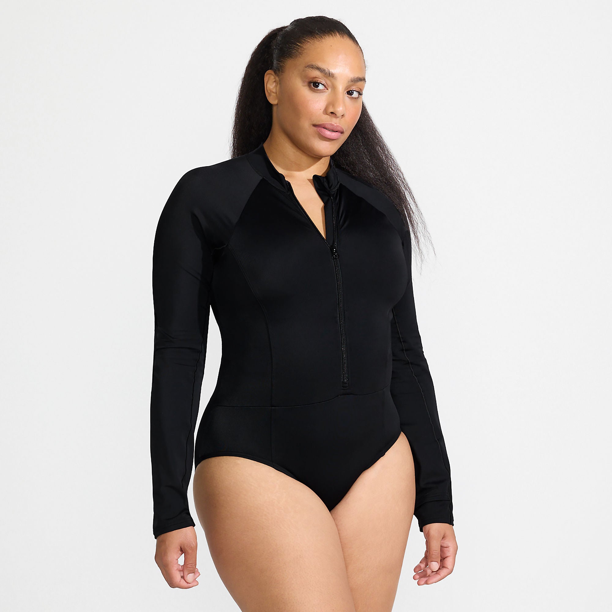 Imagine putting on your suit and never giving it a second thought. No shifting here, no tugging there. Our Tugless Tank has been a long-time favorite for its stay-put fit that doesn't hold you back. And now it is available in this zip front style with mock neck and long sleeves to give you plenty of extra coverage from the sun.